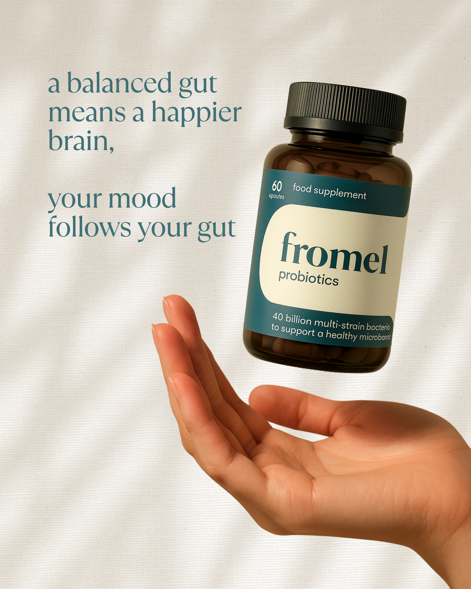 Fromel’s symbiotic probiotic & prebiotic supplement combines clinically studied Lactobacillus and Bifidobacterium strains with natural inulin and bamboo fibre to nurture a diverse, balanced gut flora. Our plant-based HPMC capsules protect live cultures until they reach the small intestine, supporting digestion, immune function, nutrient absorption and lasting microbial resilience. Experience reduced bloating, improved energy, immune support and renewed vitality.